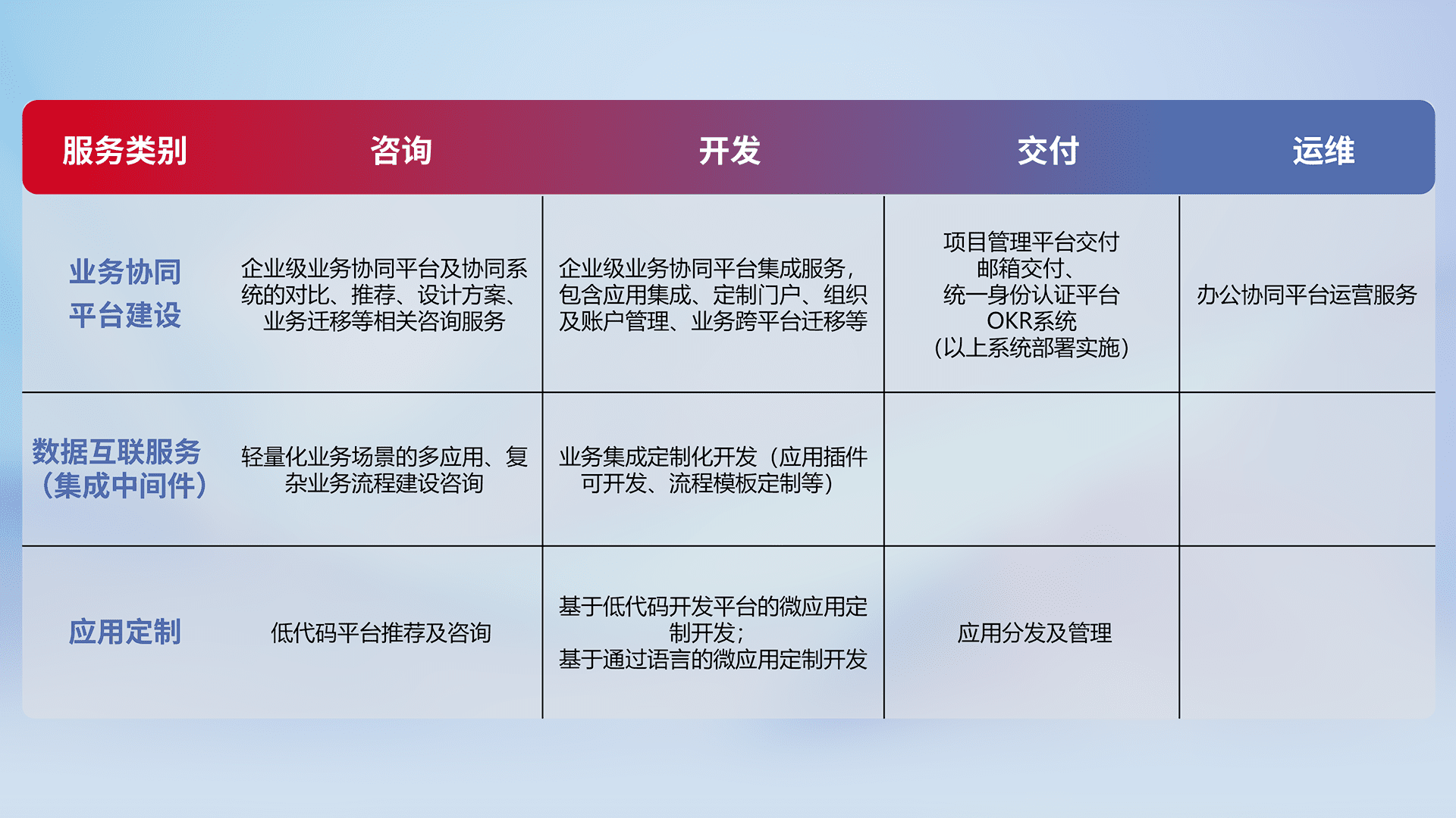 针对钉钉、、、、企微、、、、IDaas等平台级产品提供产品的规划、、、方案、、交付、、、定制化开发等服务,,,,实现如统一协同办公、、、智能客户服务、、、、混合会议管理、、智能数据查询、、、、等业务场景,,实现数字化转型。。。